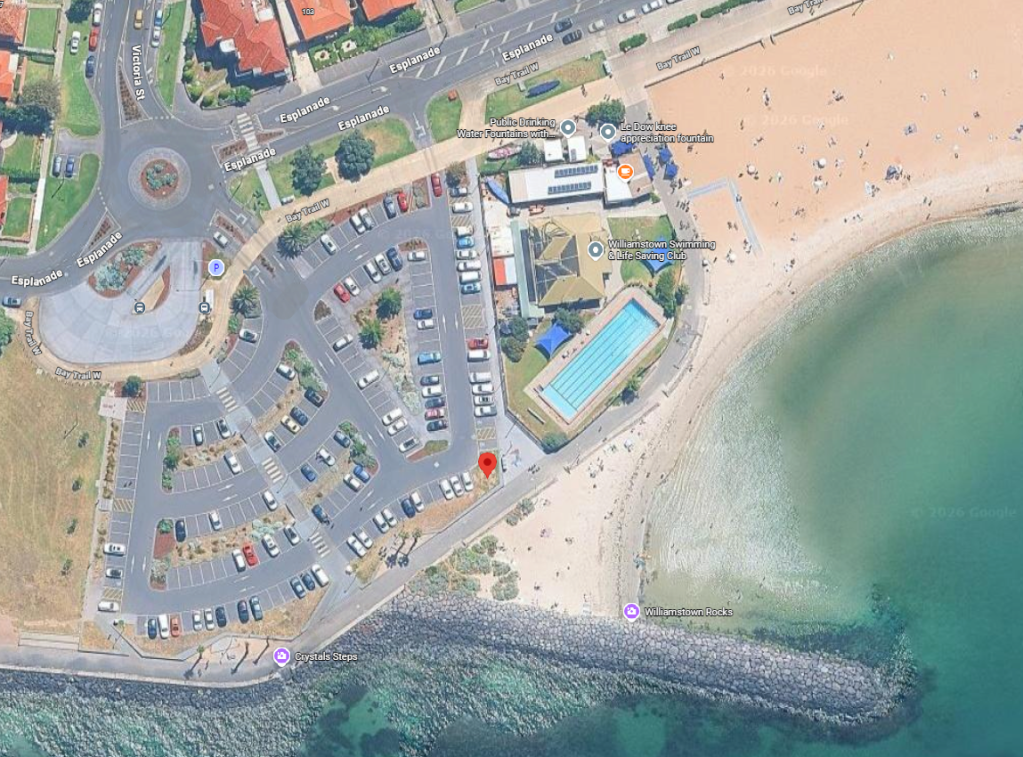 Our open water swim groups and lessons meet HERE at the western end of Williamstown Beach.