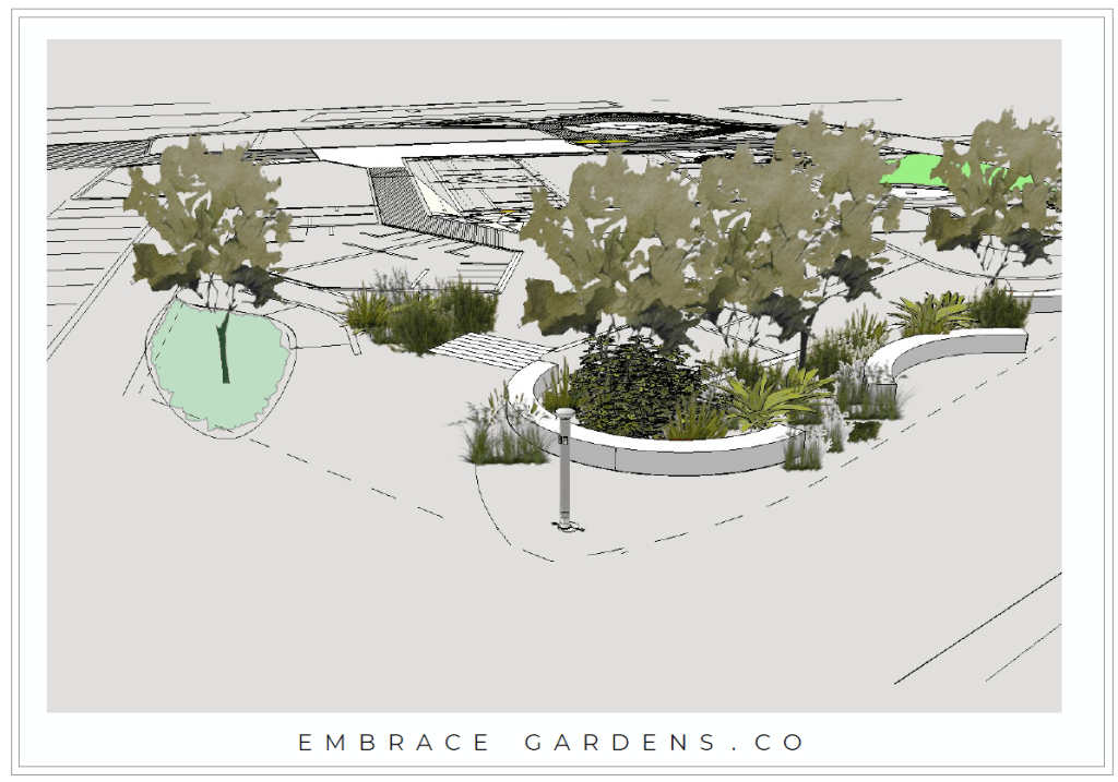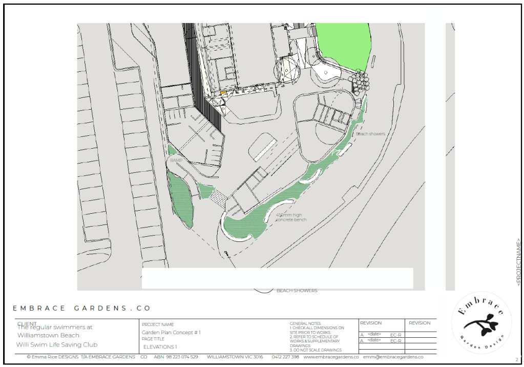 In Embrace Design’s plan, green areas and seating sit between the pathway and the wall of the WSLSC buildings. The south west corner of the WSLSC site no longer creates a choke-point at the carpark, but an inviting, welcoming public space: